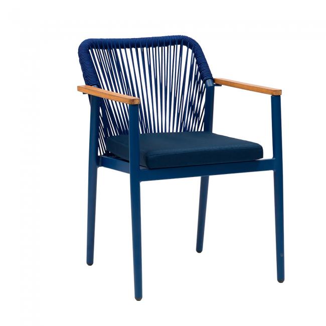 Cadeira para uso externo de alumínio com espaldar em trama de corda náutica, braços em madeira teca e almofada com tecido repelente à água. Empilhável.