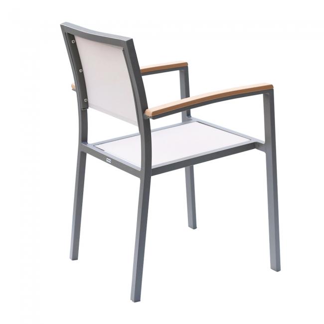 Cadeira em alumínio com braços. Assento e encosto revestidos em tela