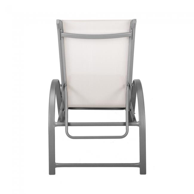 Espreguiçadeira em alumínio. Assento e encosto revestidos em tela.