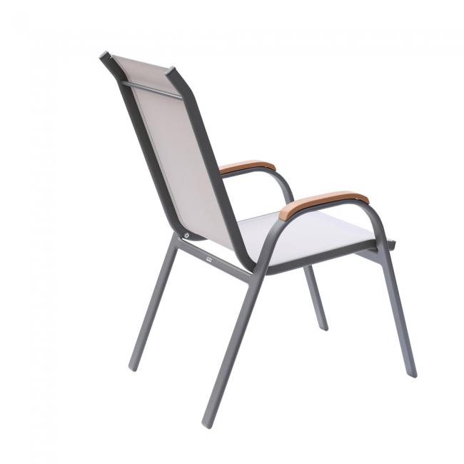 Cadeira em alumínio com braços. Assento e encosto revestidos em tela